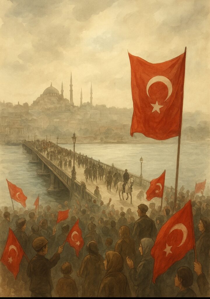 6 Ekim 1923 sabahı İstanbul’un üzerine bir sessizlik çökmüştü; o sessizlikten beslenen bir beklenti vardı. Sis, Boğaz’ın sularını ve Haliç’in kıyılarını sararken, minarelerden yükselen ezan sesi ve Galata’dan gelen adım sesleri bu sessizliği delinmişti. Şehrin her köşesinde farklı bir hayat, farklı bir heyecan, farklı bir hafıza vardı. Her ev, her dükkân, her taş döşeli sokak kendi hikâyesini fısıldıyordu; beş yıl süren işgalin ağırlığı hâlâ hissediliyordu, ama bugün değişim rüzgârı geliyordu. Kadıköy’de bir kahvehanede çay tenceresinin fokurdaması, Boğaz’dan gelen hafif rüzgârla karışıyordu. Balıkçılar sandallarını kıyıya çekmiş, ağlarını toplamış, gözleri ufukta dalgalanan beyazları arıyordu. Sahil boyunca yürüyen insanlar birbirine dokunmadan geçiyor, ara sıra sessiz bir gülümseme veya başını sallamakla kendi memnuniyetini ifade ediyordu. Bir grup çocuk, boş bir arazide bayrak parçalarını dalgalandırarak oyun oynuyordu; ellerindeki kırmızı kumaş, sabah güneşiyle buluşunca adeta bir umut işareti gibi parlıyordu. Galata köprüsünden geçenler, Haliç’in sularında yansıyan ışığı izlerken geçmişin gölgelerini fark ediyordu. Kırık pencereler, kapanmış dükkanlar, terk edilmiş evler hâlâ oradaydı, ama insan bakışı bu defa yalnızca acıyı değil, beklenen geleceği de görüyordu. Sokaklarda, işgalin simgesi hâline gelmiş bayrak direklerinin yanında artık yeni bir sabahın ilk işaretleri beliriyordu. Her köşe başında, her balkonun kenarında, gizlice saklanan bayraklar göğe doğru uzanıyordu. Harbiye’den başlayan yürüyüş, Beyoğlu’na, ardından Saraçhane’ye doğru ilerledikçe kalabalık büyüyordu. Şehrin sokakları sessiz bir ritimle doluyor, ayak sesleriyle, kalp atışlarıyla, nefeslerle birleşiyordu. İnsanlar, bir zamanlar bastırılmış olan özgürlük duygusunu yeniden keşfediyordu. Yaşlılar pencerelerden bakıyor, geçmişin acılarını hatırlıyor, gençler ise ilk kez gözlerinde korku olmadan geleceğe bakabiliyordu. Kadınlar, başörtülerini düzeltmiş, sessiz ama kararlı bir şekilde bayraklarını kaldırıyor, çocuklar ellerinde kumaş parçalarıyla koşuşturuyordu. Boğaz’ın karşı kıyısında, Üsküdar ve Kadıköy sahillerinde aynı sessizlik ve aynı hareketlilik vardı. Her kıyı, her semt kendi tarihini fısıldıyor, İstanbul’un tüm hafızası bir anda canlanıyordu. Gemi düdükleri, martı çığlıkları ve çocuk kahkahaları bir araya gelerek şehrin yeni ritmini oluşturuyordu. Bu ritim, yalnızca bir şehirde değil, bir millette yeniden doğan umudun sesiydi. Beyaz at üzerinde ilerleyen Şükrü Naili Paşa ve askerlerinin varlığı, sokaklarda gözle görülmese de hissediliyordu. İnsanlar, kalabalığın ortasında olmasa da onun gölgesini, disiplinini ve kararlılığını duyumsuyordu. Her adım, her nefes, İstanbul’un tarih boyunca yaşadığı acı ve direnişin yankısıydı. Halk, sessiz ama emin adımlarla şehri sahipleniyordu. Gün ilerledikçe İstanbul’un üzerindeki sis çözülüyor, sokaklar ve meydanlar daha görünür hâle geliyordu. Kadınlar evlerinin önünde duruyor, çocuklar koşuyor, yaşlılar sessizce gülümsüyordu. Minarelerden yükselen ezan, bir müzik gibi şehrin dört bir yanına yayılıyor, insanların içinde yankılanıyordu. Bayraklar, balkonlarda, direklerde, dükkanların önünde dalgalanıyor; her dalgalanış bir şehrin, bir milletin özgürlük duygusunu temsil ediyordu. O gün İstanbul’un her taşında, her nefesinde, her insanında bir tarih yazılıyordu. Bir millet, yıllar süren işgalin ardından yeniden kendi kimliğiyle buluşuyor, şehrin kalbinde yeniden atıyordu. İnsanlar konuşmadan, bağırmadan, sadece bakışlarıyla, nefesleriyle ve sessiz varlıklarıyla zaferi kutluyordu. Bu zafer, bir bayrak gibi göğe yükseliyor ve şehrin üzerine düşen ışıklarla birleşiyordu.